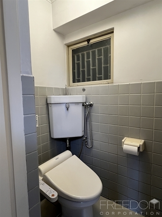 シンプルなキッチンは2口コンロ付き(残置物)。洗濯機置場はバルコニーにございます。トイレ・洗面・お風呂はレトロなタイルが健在です。