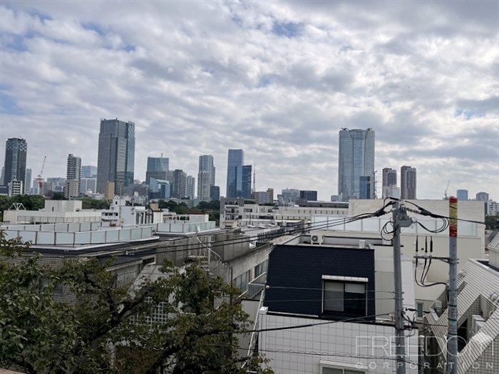 南東側のバルコニーと、南西側の窓からの眺望。二面採光の窓からは東京タワーや六本木方面、渋谷方面と都会らしい眺望が広がります。視界が開けているので日当たりも良く、平米数以上に広く感じます。