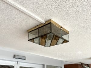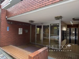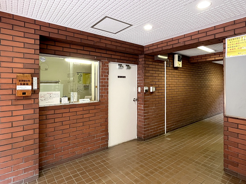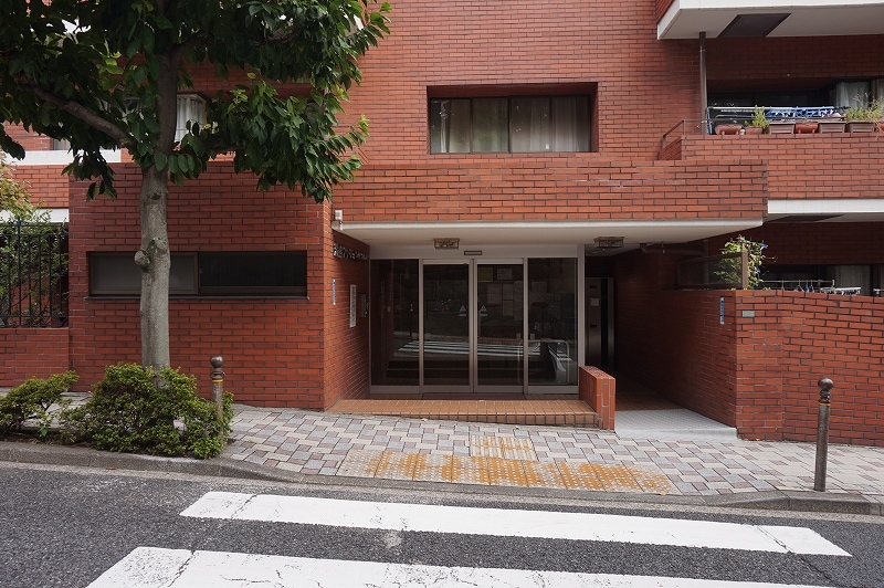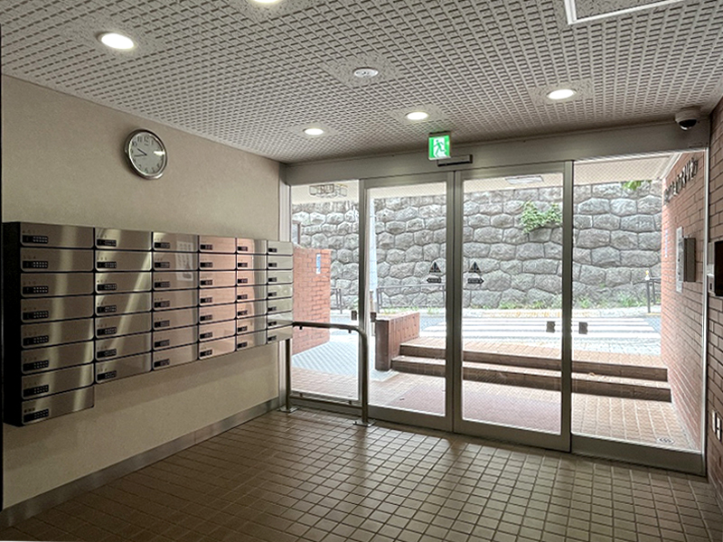 レンガ塀に似た雰囲気の色味のタイル貼りの重厚な外観。坂の上の方から見下ろすと、遠くにスカイツリーが見え、なんだか気分が上がります。2017年に大規模修繕工事実施済みなど管理体制も良好。エントランスにはオートロック、宅配ボックスも備わっています。良いアクセントになっているレトロなガラスの照明も、この年代のマンションならでは。