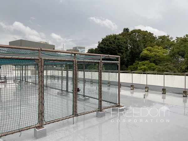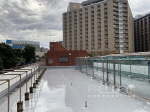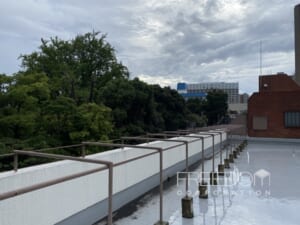 屋上にある共用の物干し場。ここからも旧岩崎邸庭園の緑を贅沢に楽しめます。旧岩崎邸庭園越しに、同じく湯島エリアのヴィンテージマンション「秀和湯島レジデンス」がちらりと見えました。