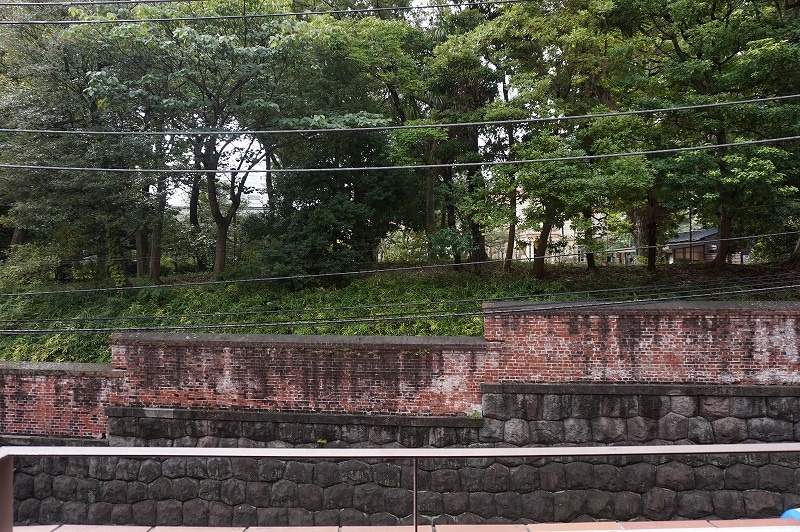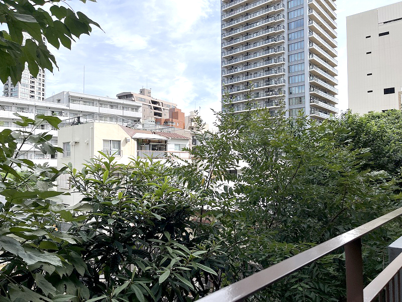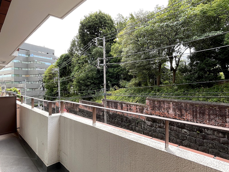 バルコニーはワイドスパンで奥行きもゆったりとしています。前方には古い石垣と煉瓦塀の上に旧岩崎邸庭園の緑が広がり、風情を感じる眺望です◎