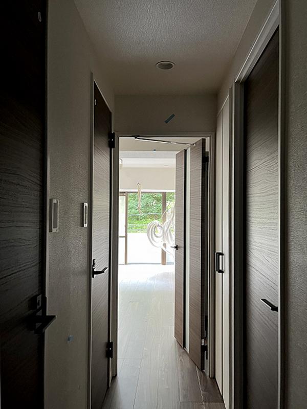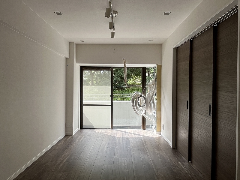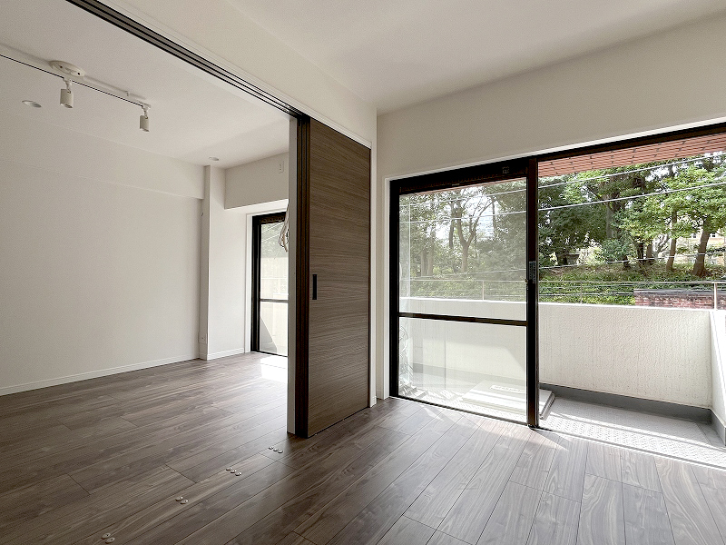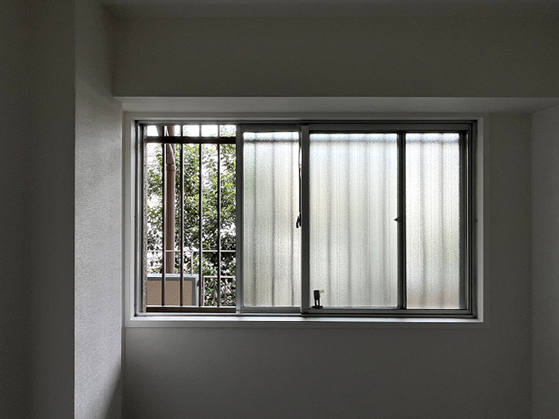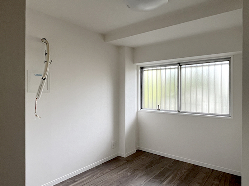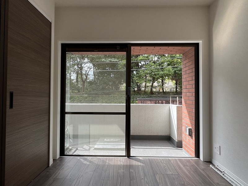 北側の洋室は約4.59畳。共用廊下側なので曇りガラスのサッシですが、ガラス越しでも廊下の向こうの緑を感じられます🌿