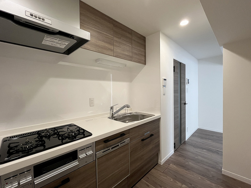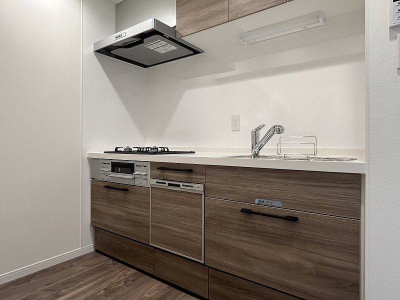 キッチンは適度なおこもり感がうれしいセミオープンなスペース。3口ガスコンロ・浄水機能付水栓・食洗機付きです。背面には冷蔵庫やちょっとしたカウンターなどを配置できる余裕がございます。