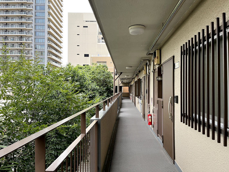 共用廊下は隣接するお寺の緑に癒されます。お寺内のお墓が少し見えますので気になる方は現地でお確かめください。