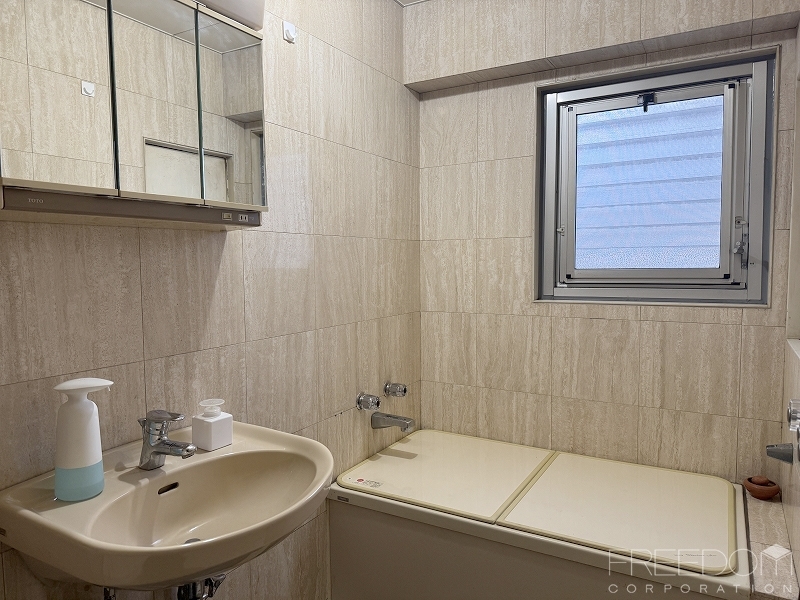 水まわりもリニューアル済みです。洗面台とバスルームがまとまった2点ユニットバスですが、追焚きと浴室乾燥が備わり、快適にお住まいいただけます。トイレが独立しているのも嬉しい。