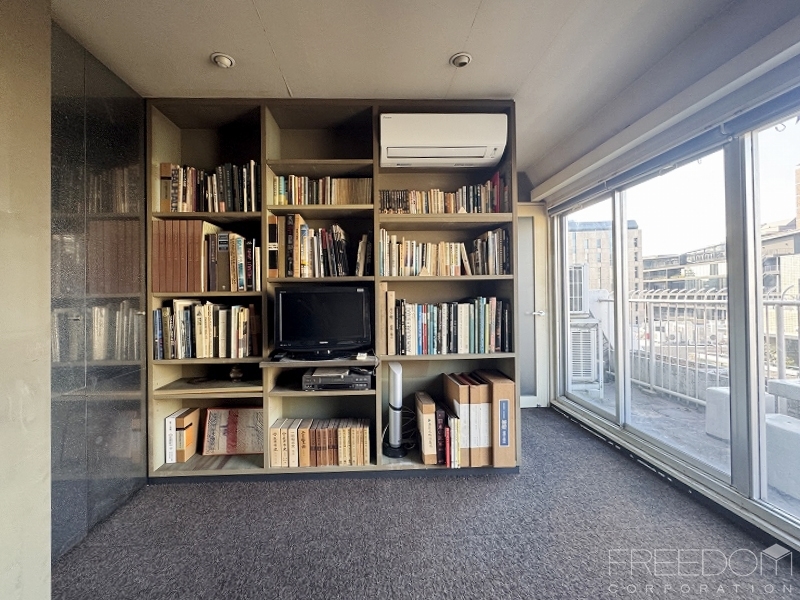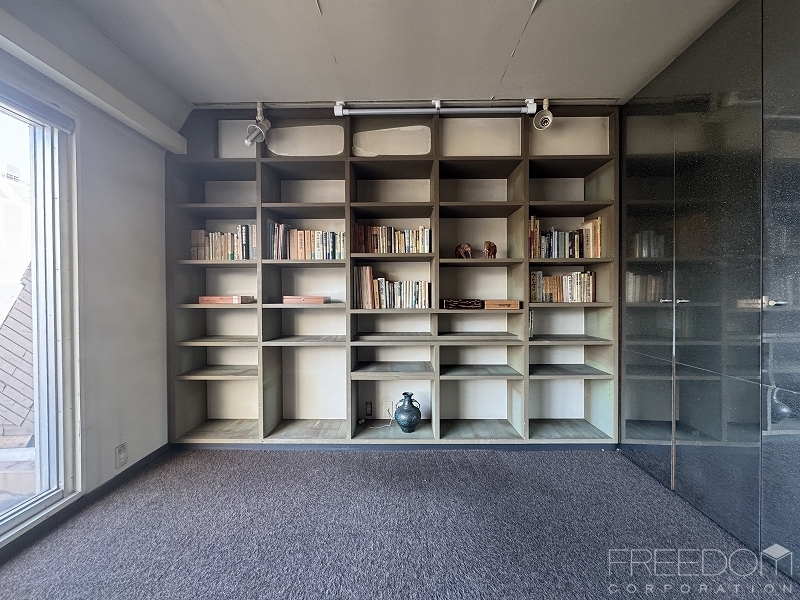 建築士の売主様が仕事場として利用されていたので、造り付けの大きな書棚が向かい合せで並びます。