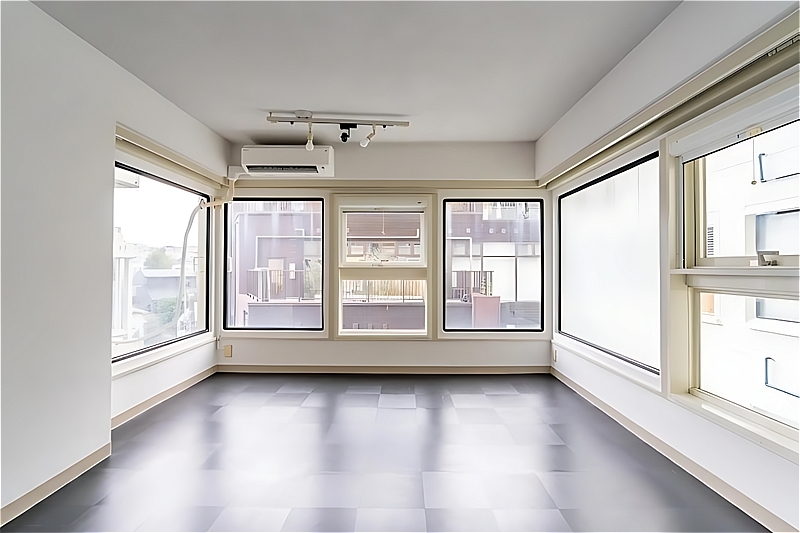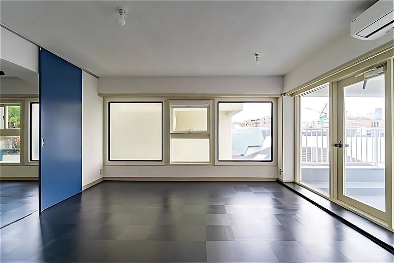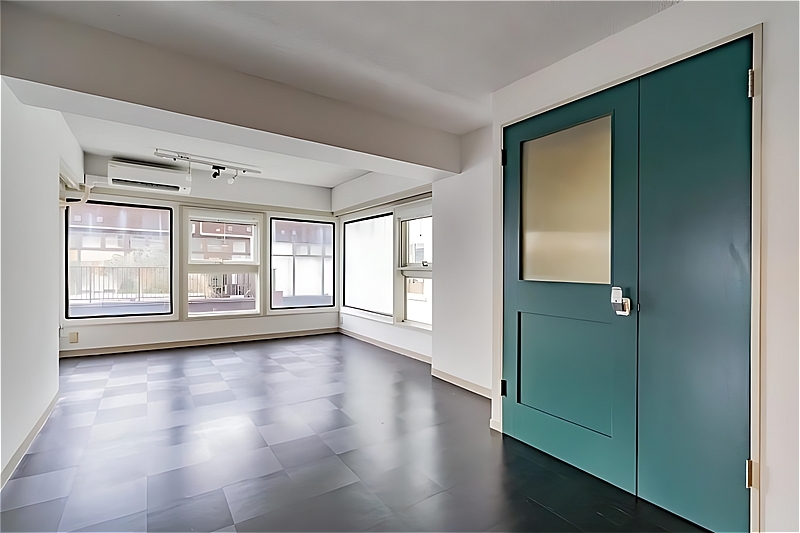 玄関側には約26帖の細長いLDKが広がり、その奥に約10帖の洋室が2室、さらに独立性の高い洋室が一部屋配置されています。間仕切りを最小限に抑えた設計により、回遊性のある動線が生まれ、空間にゆとりと自由度が感じられます。また、採光も十分で、お部屋のどこにいても自然光を感じられる心地よさがあります。住居だけでなく、事務所としてもレイアウトの自由度が高く、多様な使い方に対応できそうです。
