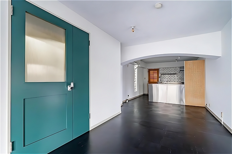 現在は真っ白な外観に生まれ変わっていますが、ブルーと真っ赤な扉のコントラストがレトロな趣の共用部やアーチ状の梁は室内でも使われていて、まるで外国のアパートのような雰囲気。各所に残った優雅な面影は今も健在です。