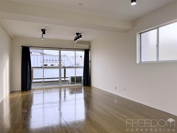最上階、角住戸で窓が多く明るい室内。天井高もこの時代のマンションにしては高めで、開放的な空間です。白の塗り壁にライティングレールとシンプルな内装なので、どんな家具も馴染みそう。使い勝手の良いお部屋です。